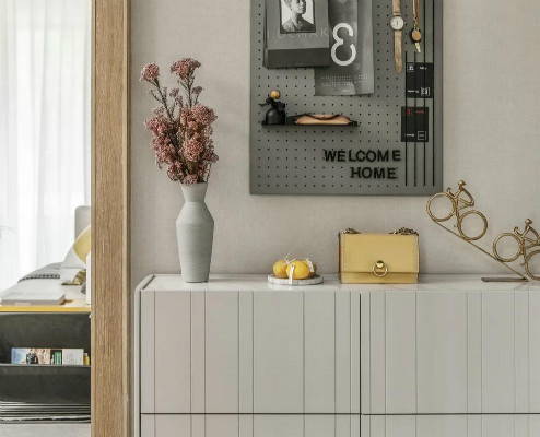 进门是玉溪城市林语的玄关空间,装上一个灰色的鞋柜,加上浅细线条,与柜缝相融,弱化缝隙的美感破坏。鞋柜空间立体上分为三个部分,底部空间用来放置日常更换的鞋子,中部做双开门设计,用以放置名贵收藏的鞋品,放置鞋油等用具,上部空间用以收纳包包、钥匙和一些随手用品,加入艺术感十足的摆件和花瓶,墙上安装了洞洞板挂钩,既提高了储纳空间,也让空间立挺起来。